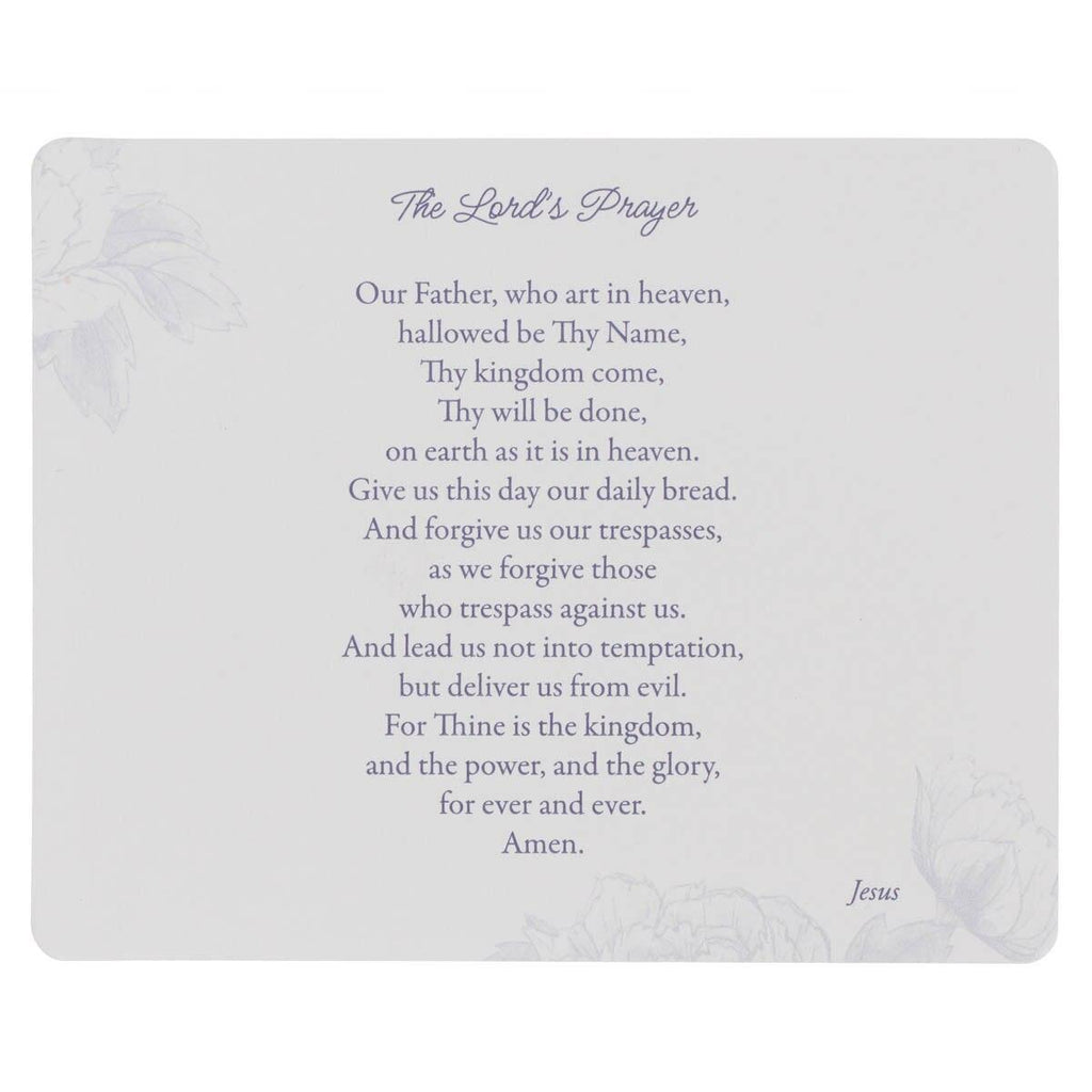 Inside the tin are 50 double-sided cards, each colored soft blue and decorated with a floral design. The front of each card features a prayer, and the back is lined to note or add your own prayer.