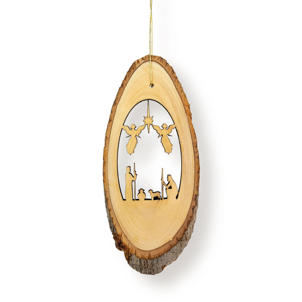 Holy Land Olive Wood Live Edge Oval Slab Shepherds with Angels Ornament