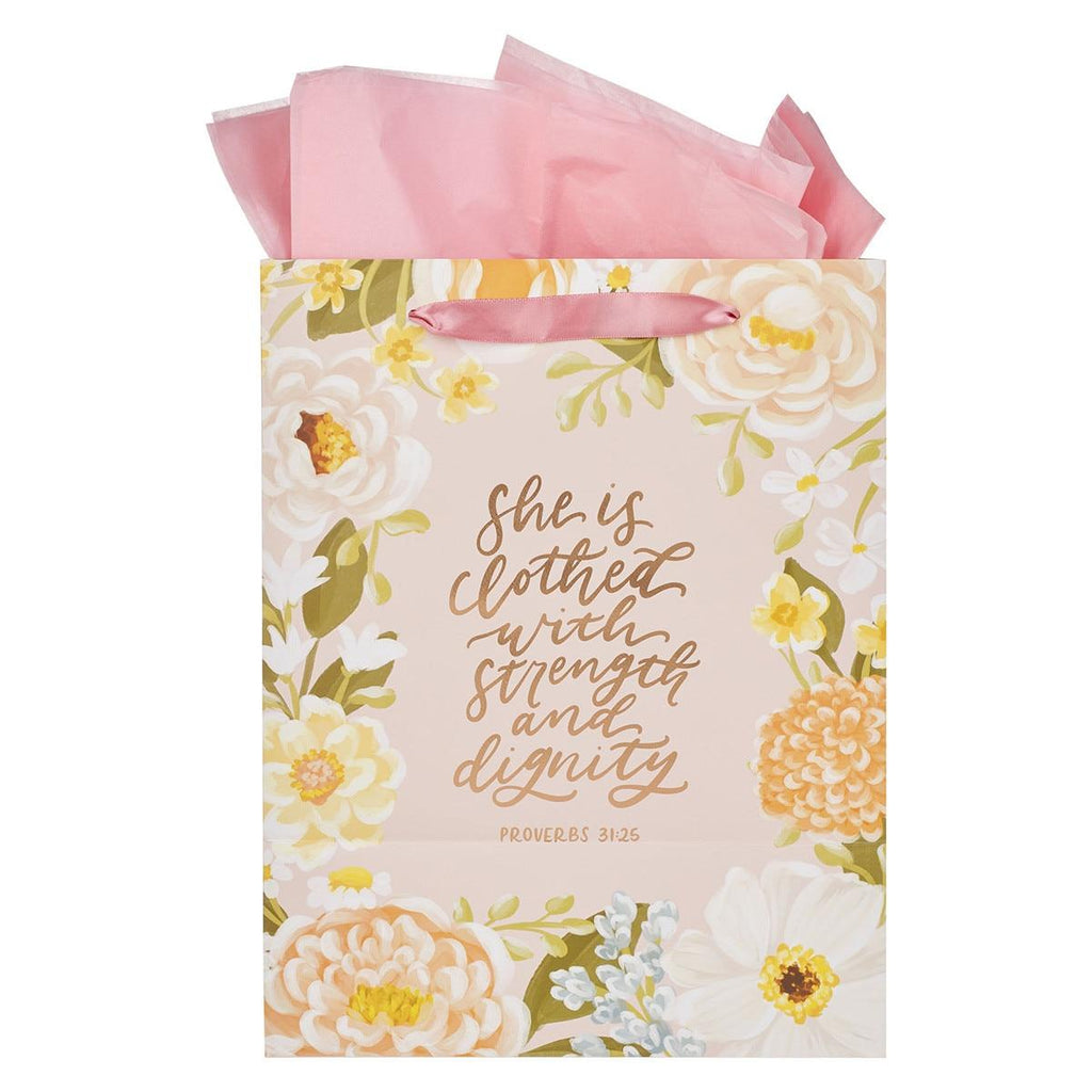 Honor a mother or mentor's investment in your life by presenting your gift in the elegantStrength and Dignity Pink Floral Large Portrait Gift Bag.