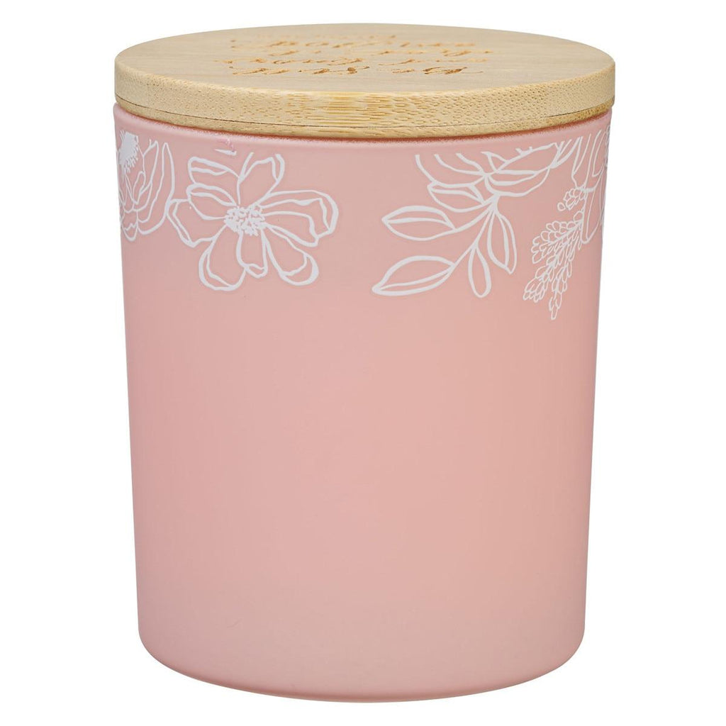 The pink glass jar features a white floral border around the rim and a white hand-lettered text in the center.