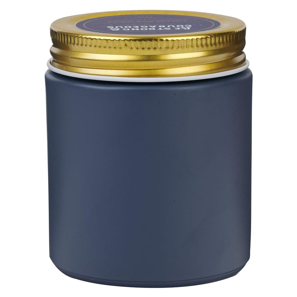 The frosty blue glass jar features a clean design with gold-foiled flourishes that accent the white-lettered sentiment.