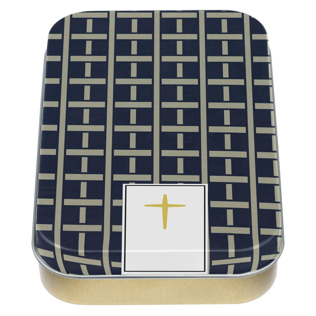 The keychain is packaged in a metal tin with a tight-fitting lid. The navy blue lid is decorated with a golden grid pattern and a thin embossed gold cross. This tin can be repurposed once the keychain is removed.