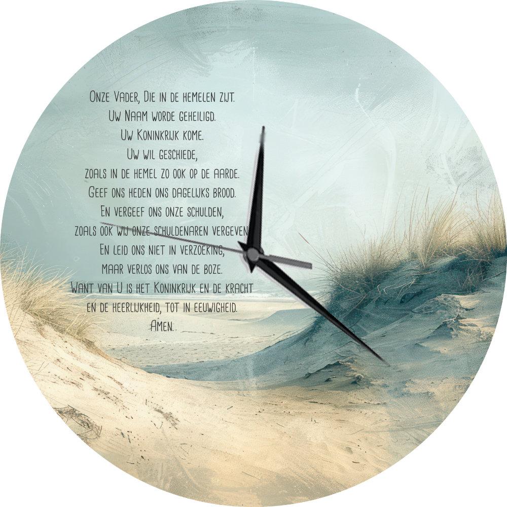 Op de wijzerplaat staat de tekst Het Onze Vader, gecombineerd met een sfeervolle strandafbeelding.