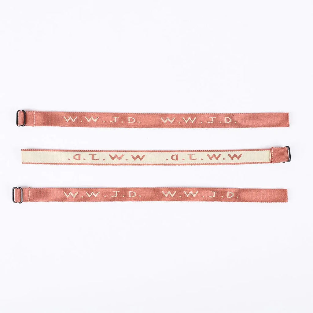 The soft terracotta-colored design features œWWJD woven in a shade of warm yellow to create a visually appealing contrast, making these bracelets a fashionable way to share your faith and values.