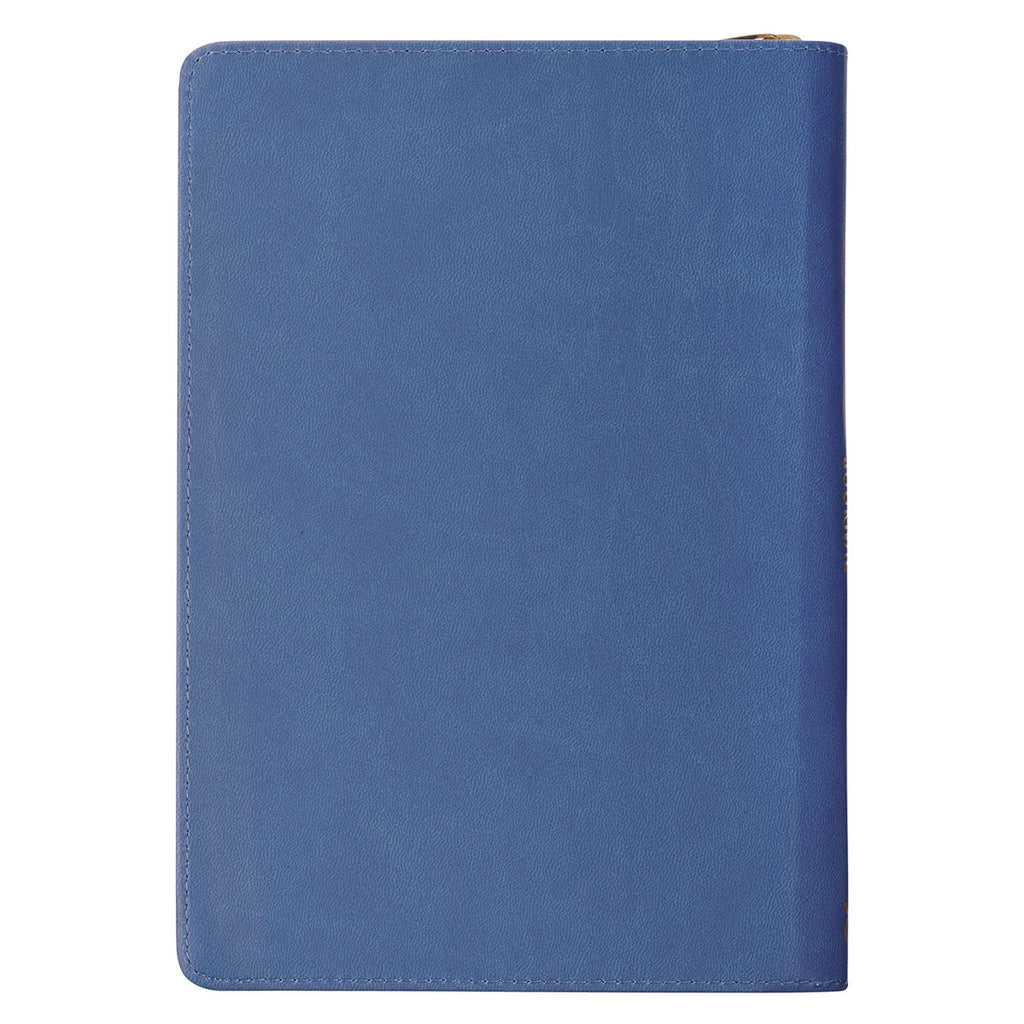 A sturdy construction is ensured with topstitching along all seams and edges of the journal. A blue zipper with a gold metal zipper pull closes the cover securely and protects the page edges. The 336 lined pages inside provide ample space for reflection with additional Scripture verse printed at the bottom of each page, and a blue ribbon marker ensures you never lose your place.