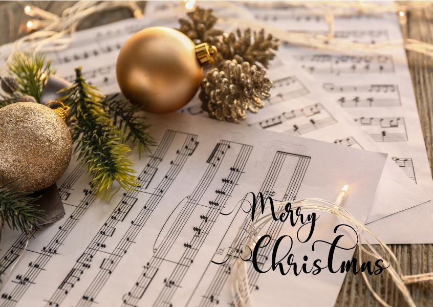 Strike a festive chord with this stunning double Christmas card, perfect for music fans. Featuring a photo of Sheetmusic with christmas boules and a cheerful and warm "Merry Christmas" message.