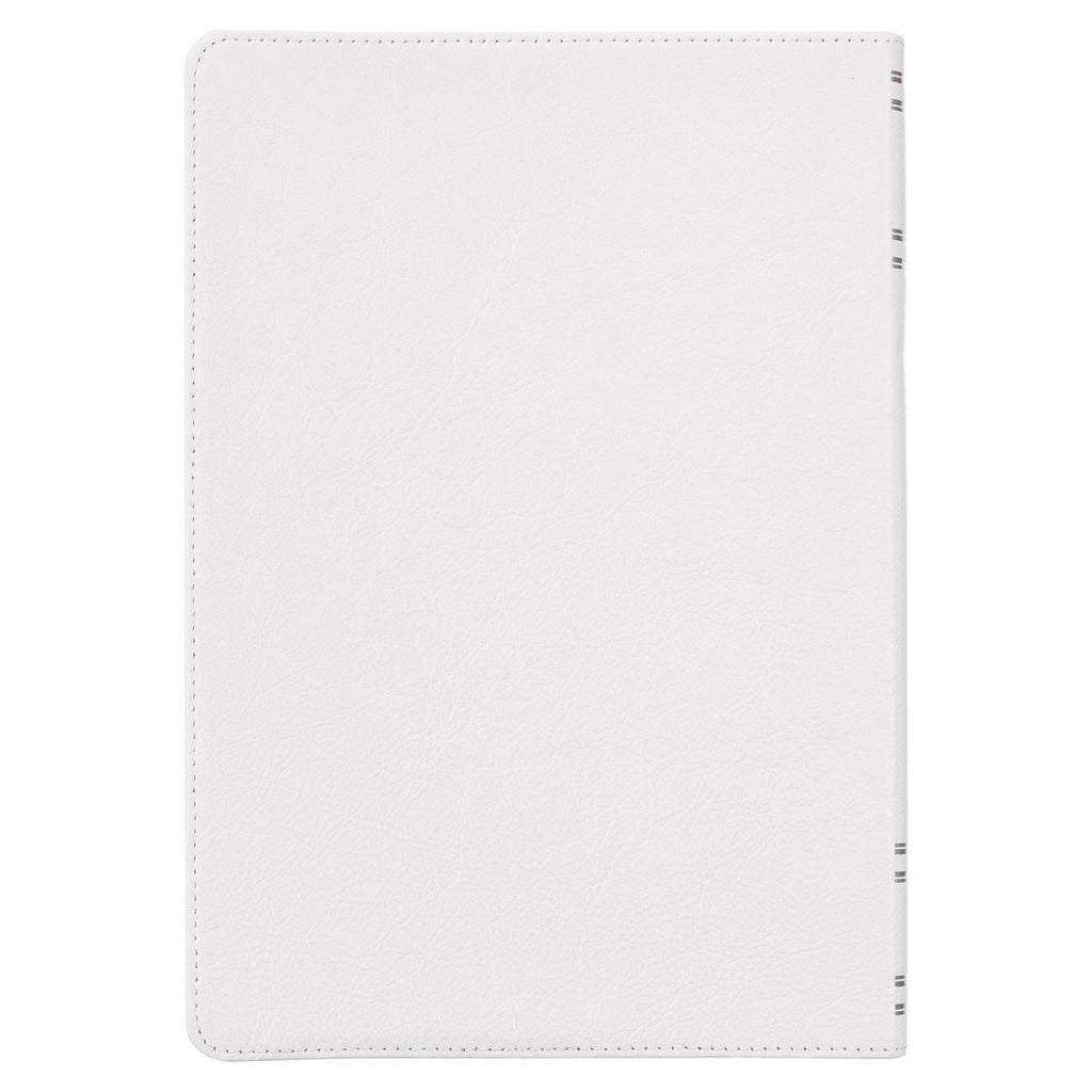 Elegant silver-foiled faux spine ribs add a classic touch to the white full-grain leather cover of this Bible. The silver-foiled title is centered on the front and pairs beautifully with the shimmering silver gilt-edged pages.
