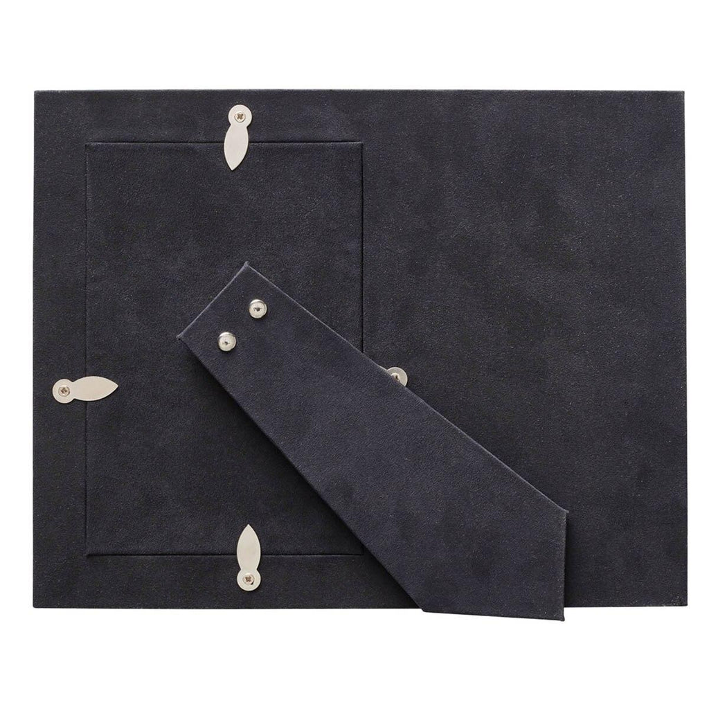 Gold stitching around the edges and seams of the larger frame and the photo insert ensures a sturdy construction and also acts as a decorative element. Clear acrylic protects the photo from scratches and dust. The back of the frame is wrapped in a soft black velvet-like material. The frame can be displayed using the attached easel. Four metal rotating tabs secure the backing and make adding or removing a photo easy.