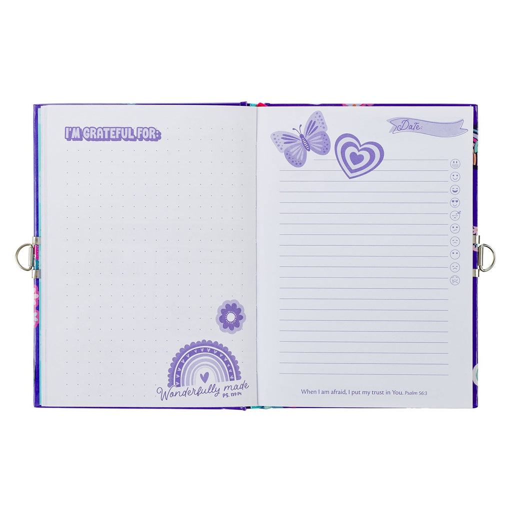 The secret diary is secured with a silver lock that has two keys. Inside the diary, you will find 160 pages for journaling, goal setting, prayer logging, doodling pages, and tracking what makes you smile. Ten rotating Scripture verses are printed at the bottom of lined pages. All the content is organized in a weekly format. A presentation page lets you add the owner's name and code it in a secret code. A ribbon marker is added to track progress.