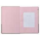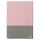 The smooth front and back covers of the Bible are separated in a color block design with a light rose pink band that covers the top two-thirds of the cover and a light dovetail gray band that covers the bottom third. A double row of topstitching joins the color blocks together. A delicate gold-foiled frame with corner scroll designs runs along the borders of the book. The gold-foiled title appears on the front cover as well as the spine, where it is paired with the KJV version reference.