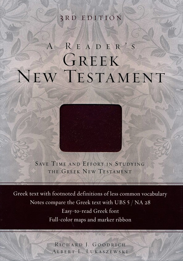 "A Reader’s Greek New Testament: Third Edition saves time and effort in studying the Greek New Testament. If a Greek word appears in the New Testament fewer than 30 times, then a definition is provided. This serves as an aid when you encounter less common vocabulary, allowing you to focus on reading, comprehension, parsing, and grammatical issues. You no longer have to interrupt your reading, searching through a lexicon! Featuring a handsome Italian Duo-Tone binding, A Reader’s Greek New Testament: Third Edition is a practical, attractive, and surprisingly affordable resource.