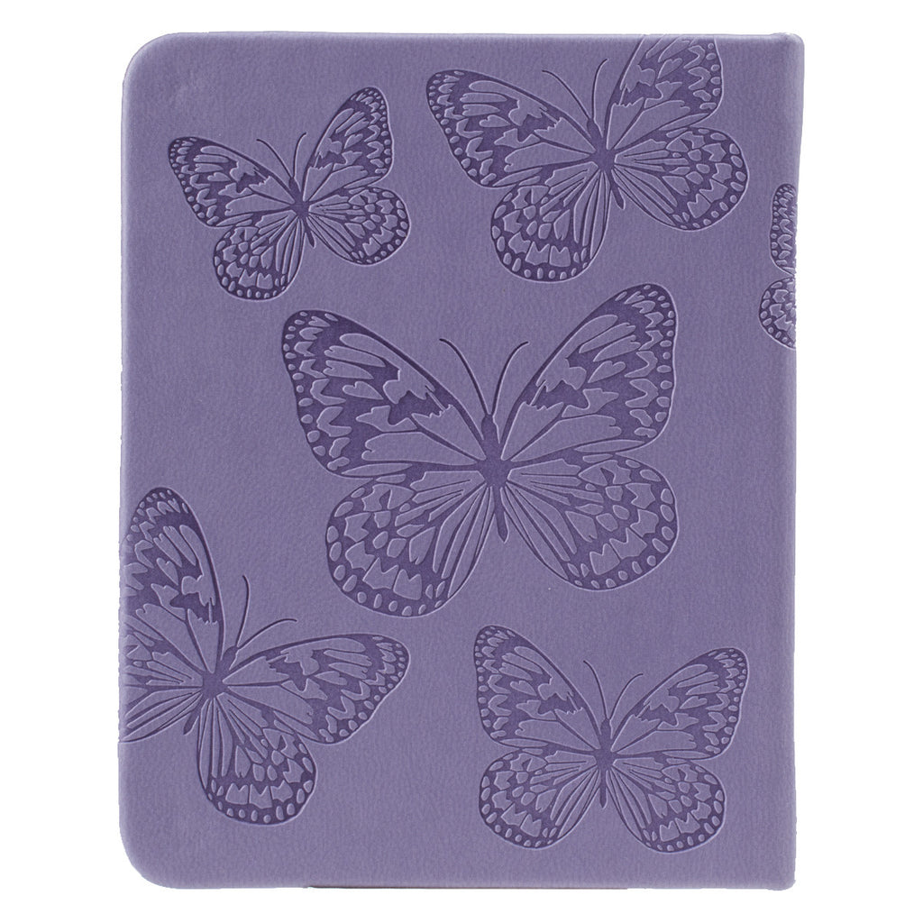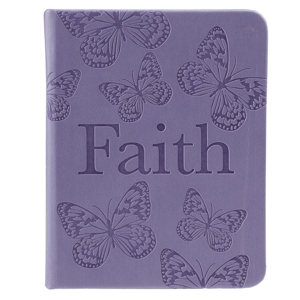 The title "Faith" and lively butterflies are debossed into the flexible purple faux leather front and back cover. Silver gilt-edged pages and an attached ribbon page marker create a joyful package for what is inside.