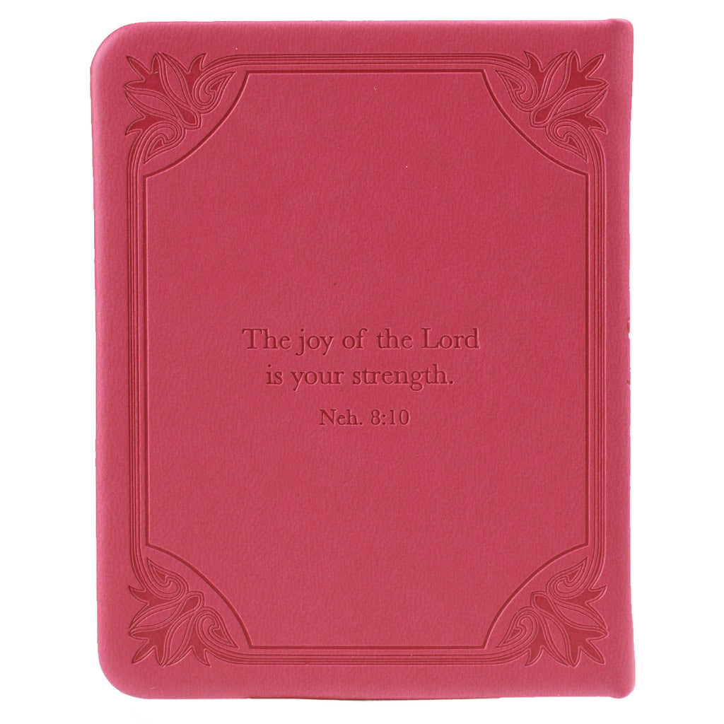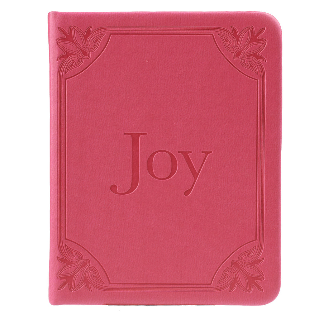 The title "Joy" and decorative border are debossed into the flexible pink faux leather front and back cover. Words from Nehemiah 8:10 are scripted into the back cover. Silver gilt-edged pages and an attached ribbon page marker create a joyful package for what is inside.