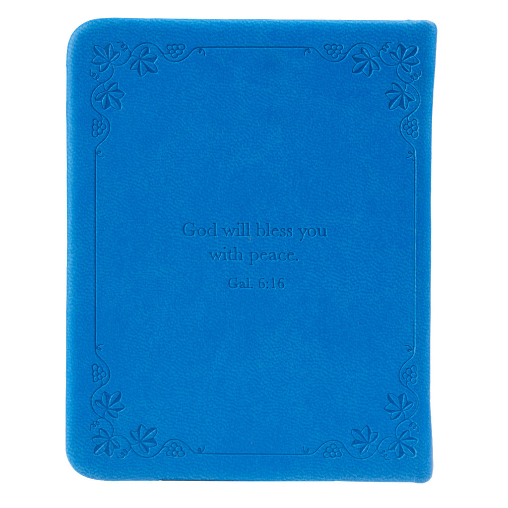 The title "Peace" and decorative border are debossed into the flexible bright blue faux leather front and back cover. Words from Galatians 6:16 are scripted into the back cover. Silver gilt-edged pages and an attached ribbon page marker create a joyful package for what is inside.