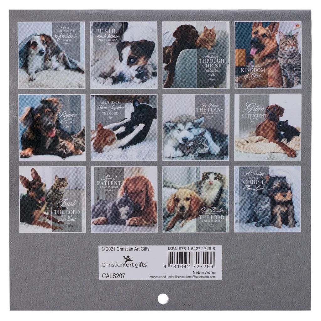 The glossy cover features a detailed photo of a gray cat and a golden retriever peacefully relaxing. The calendar's theme verse is printed in white lettering above the embracing animals.