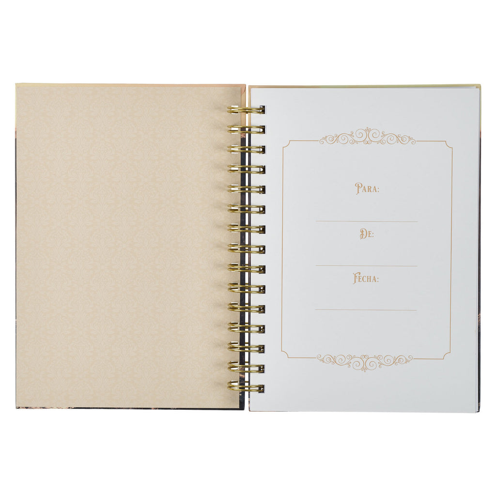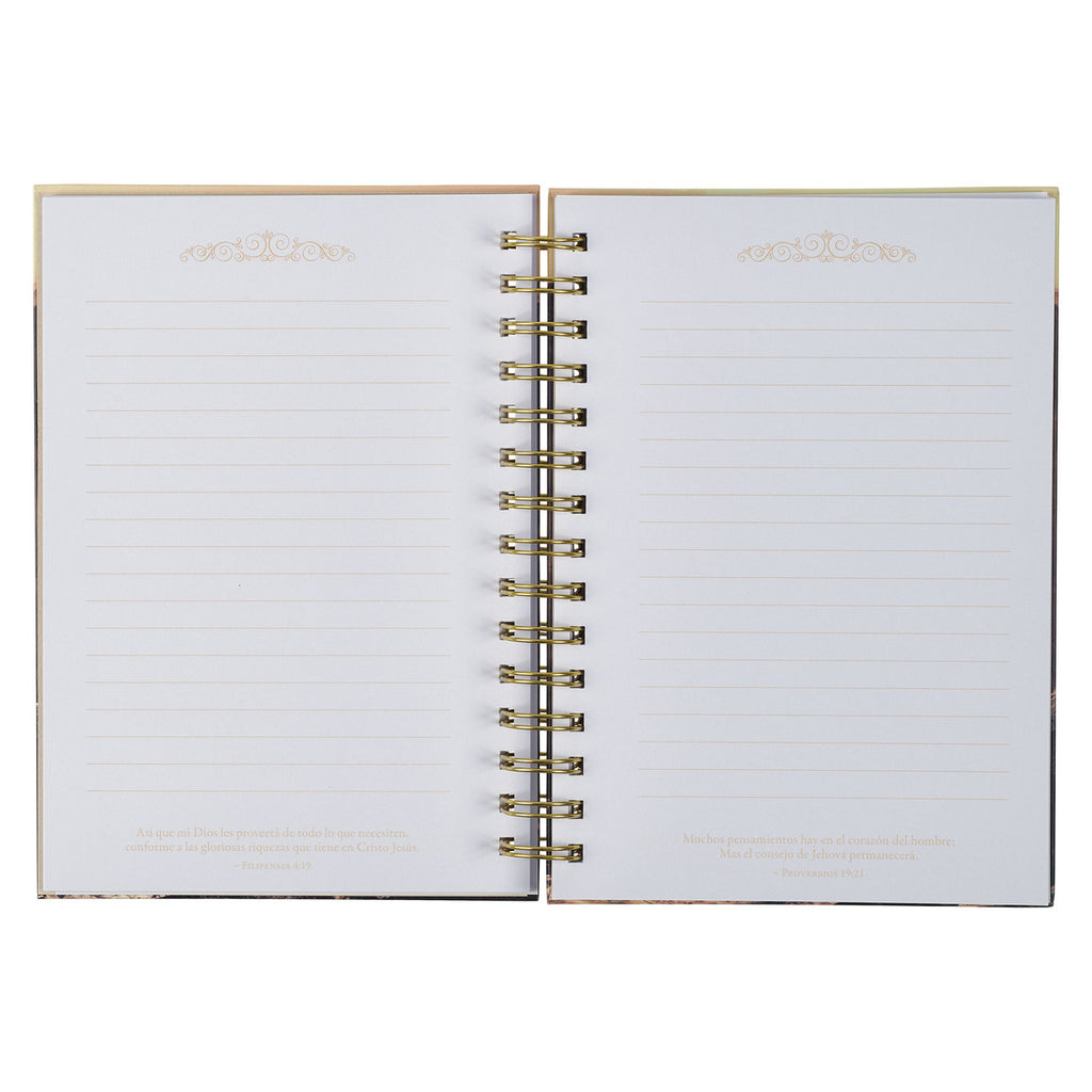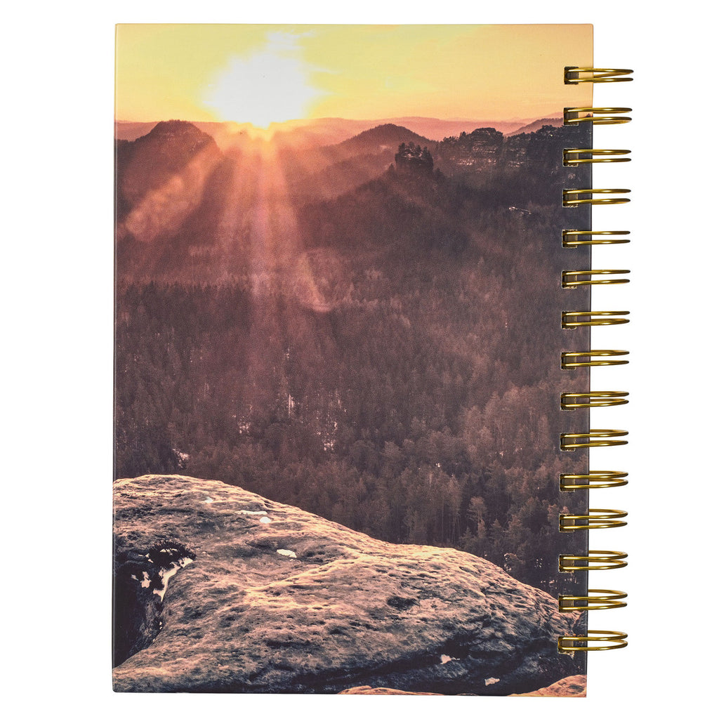 En la portada de este diario anillado de alambre se encuentra una hermosa puesta de sol que pinta el cielo de un tono dorado sobre una vista de montana. El texto biblico aparece en letras doradas.