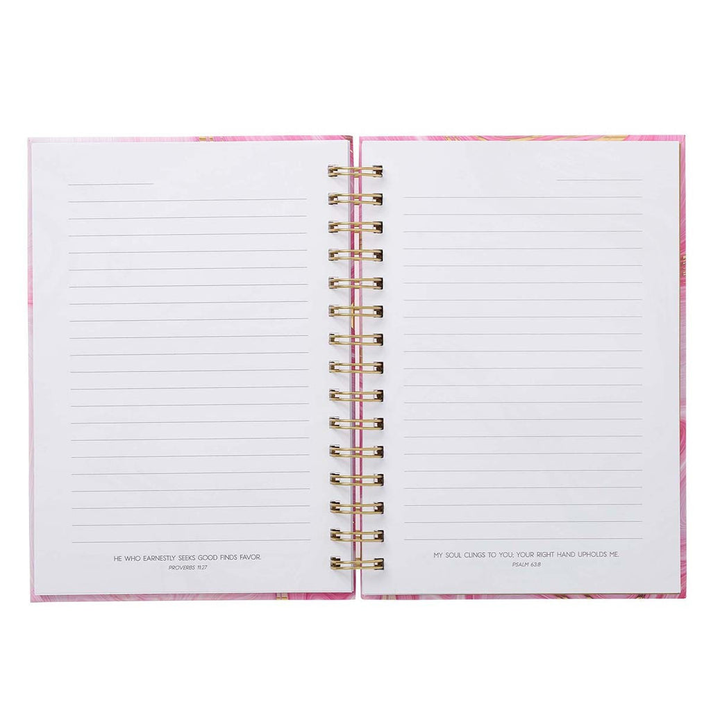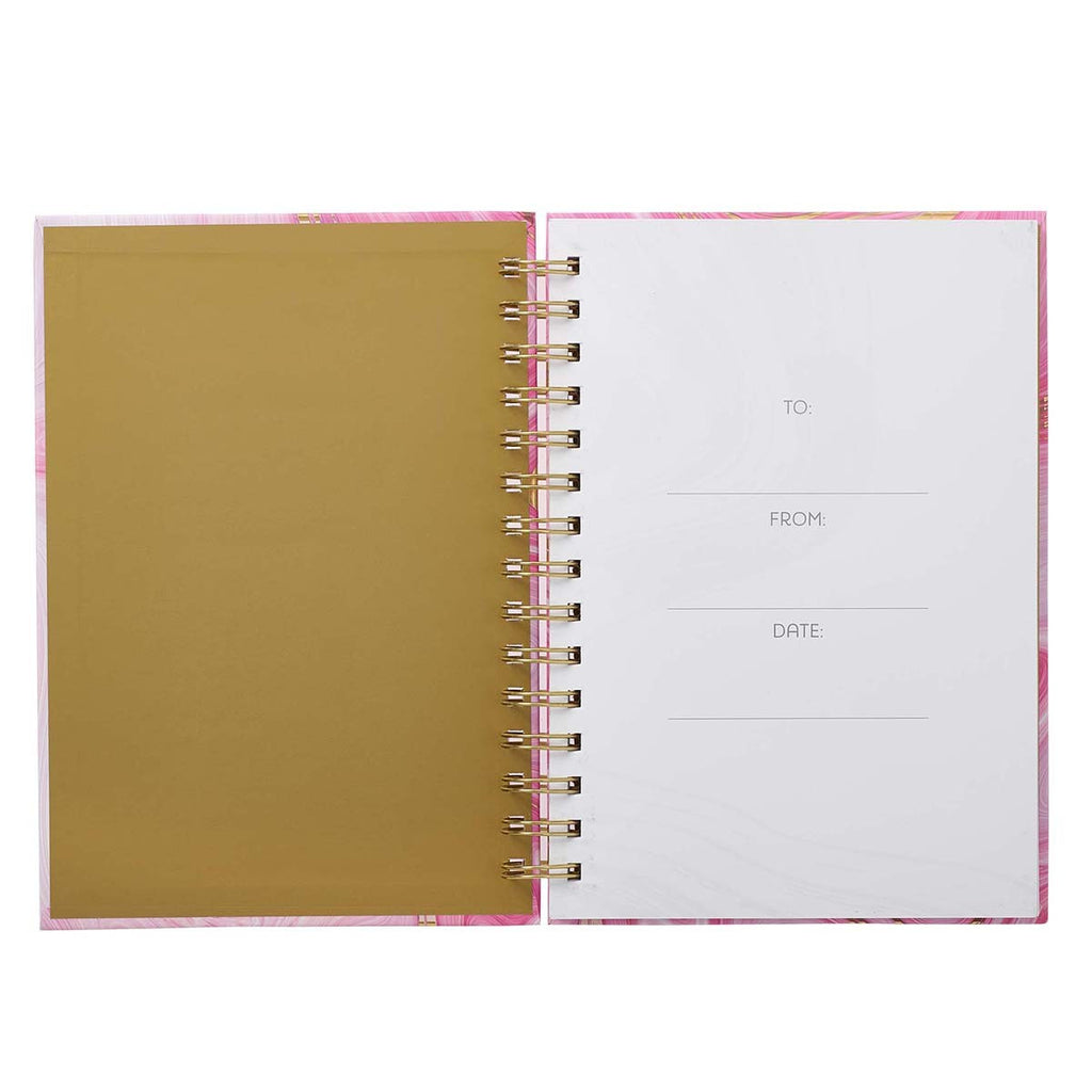 Shiny gold end pages continue the theme into the interior of the journal. The first page is a presentation page that allows you to mark the journal with your own name or give it as a gift to celebrate a special occasion. A faint watermarked marble design is visible on each of the 192 lined pages. Gold-toned wire binding complements the gold foiled accents on the front cover and the golden end pages. Every page features a Scripture verse that can be used as a memory verse or journal prompt. The hardcover provides a sturdy surface for writing and protects the journal's pages.