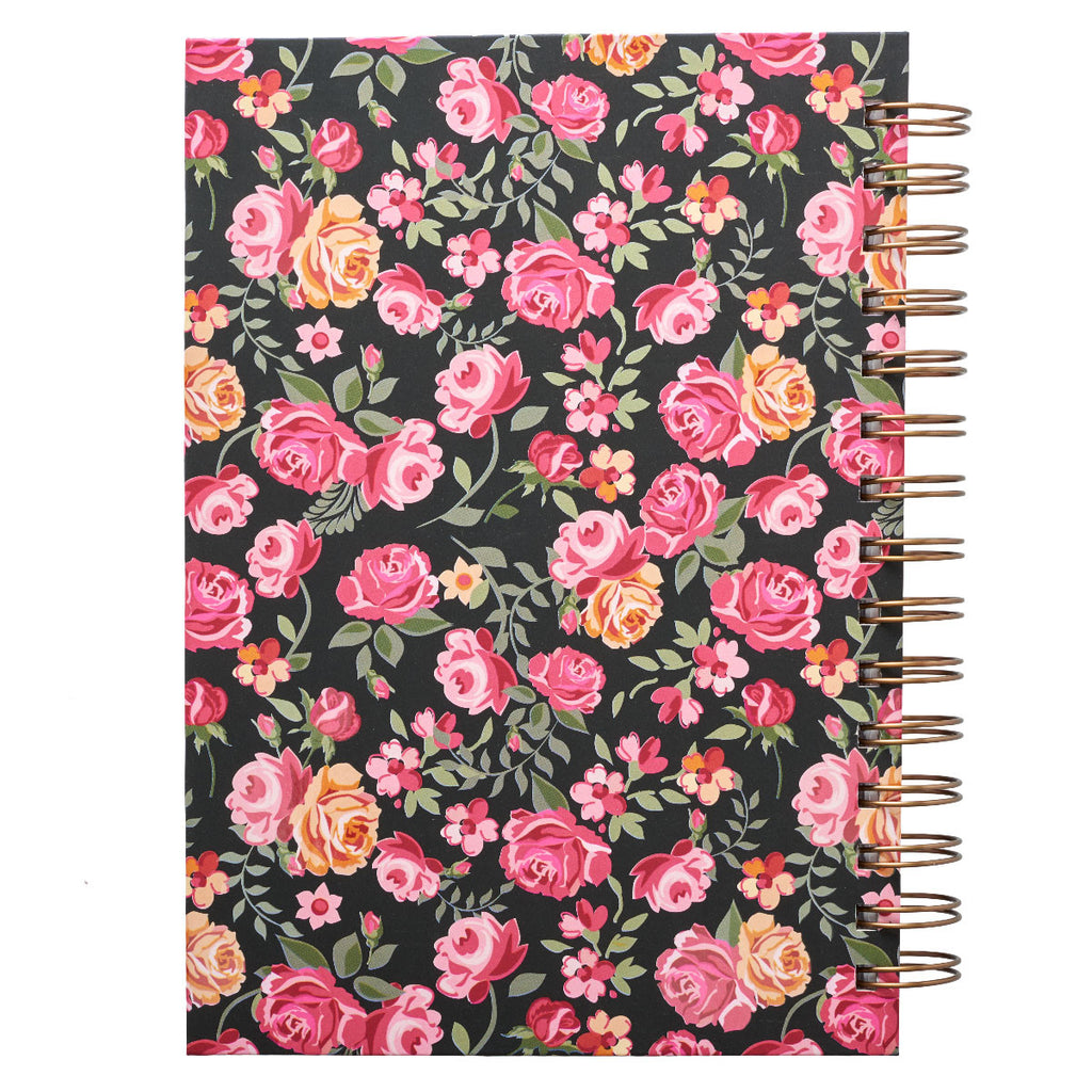 The hardcover Floral Serenity Prayer Hardcover Wirebound Journal features a black cover filled with yellow and pink roses. An excerpt from the poem is framed in a gold foiled frame and printed in gold foiled lettering.
