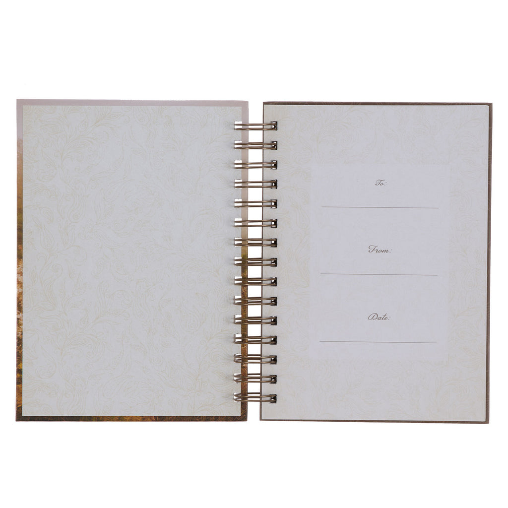 The Trust in the LORD Field Grass Wirebound Journal is part of the Mocha and Gold Trust in the LORD Collection which also includes an eco-friendly tote bag, a large landscape gift bag, and a ceramic mug.