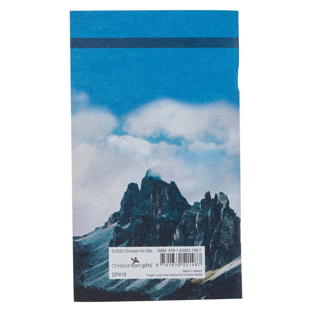 The front cover of the pocket planner features snowy mountain peaks that would thrill any avid adventurer. Set above the scene in gray lettering is the sentiment.