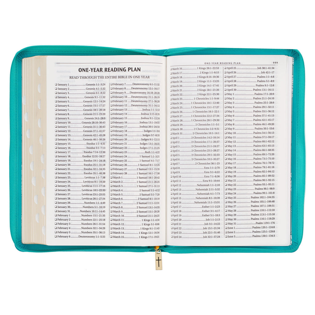 The design features of this Bible include a teal zipper with a gold metal zipper pull, ensuring the security of loose notes. The zipper pull is engraved with a cross design. Thumb indexing tabs make navigating the Bible effortless, while gilt-edged pages add an extra touch of shimmer to the overall design. Completing the ensemble is a matching teal satin ribbon page marker that provides a convenient way to keep your place. A presentation page in the front of the Bible lets you add a meaningful message to mark a special occasion.
