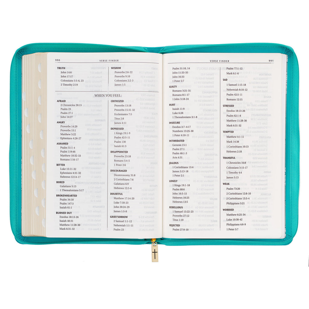 The Vibrant Teal Faux Leather Large Print Thinline King James Version Bible with Zippered Closure and Thumb Index is the perfect blend of style and convenience. This beautiful Bible offers the timeless beauty of the KJV text with the practicality of a Thinline format, thumb indexing, and a zippered closure.