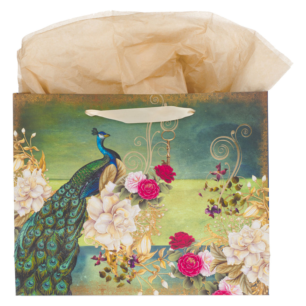 TheBlessed Blue Peacock Large Landscape Gift Bag with Card Set is part of the Blessed Blue Peacock Secret Garden Collection that includes a ceramic mug, a stainless steel travel mug, a faux leather Bible cover, a hardcover journal, a faux leather journal, a glass water bottle, a reusable tote bag, a notebook set, and a gift bag.