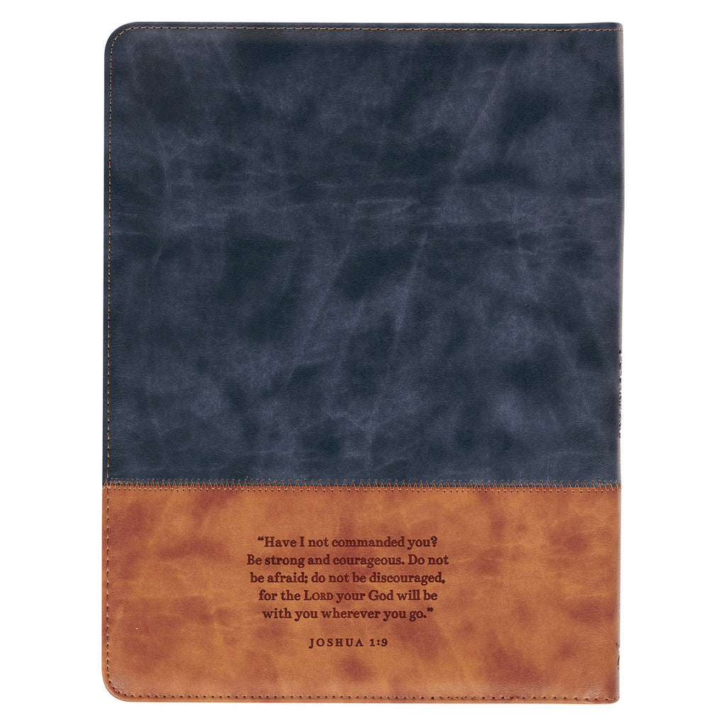 The Strong and Courageous Butterscotch and Navy Faux Leather Padfolio combines utility style to produce a padfolio that will look good on an office desk, in a student's backpack, or in a pastor's hand. Consider giving the Strong and Courageous Butterscotch and Navy Faux Leather Padfolio as a college graduation gift or a pastor appreciation gift.