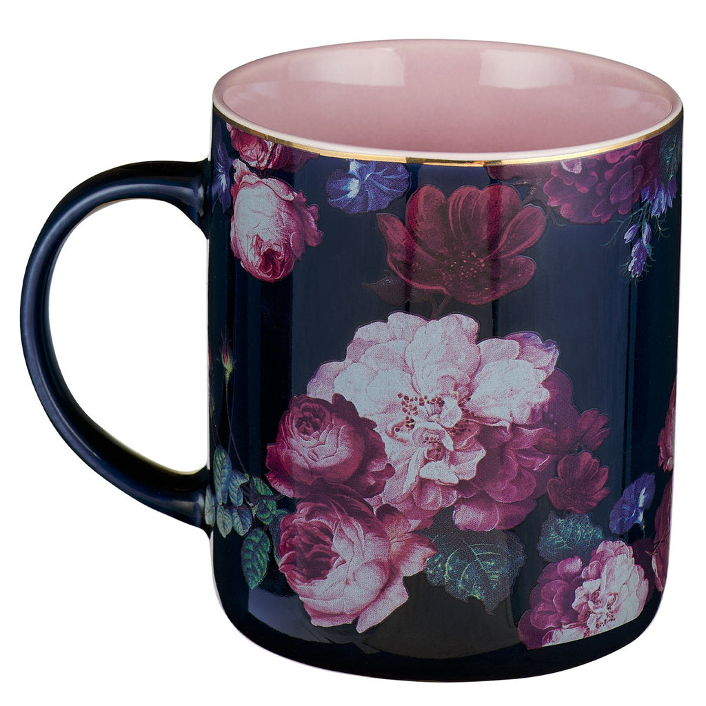 The floral design wraps around the mug to the back, where a breathtaking floral display takes center stage. A thin gold-foiled rim separates the midnight blue exterior from the glossy cherry pink interior of this generous 14 fluid-ounce mug. The delicate foil requires handwashing with warm, soapy water. To make this mug gift-ready, it comes packaged in a full-color tuck-top gift box that is easy to wrap.