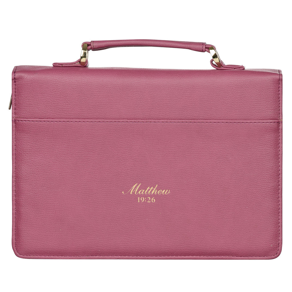This Bible cover would be an especially touching gift for someone facing a challenging season of life. The encouraging message will bring daily comfort and remind your loved one of God's power every time they reach for their Bible covered in the All Things Are Possible Vintage Dusty Rose Faux Leather Fashion Bible Cover.