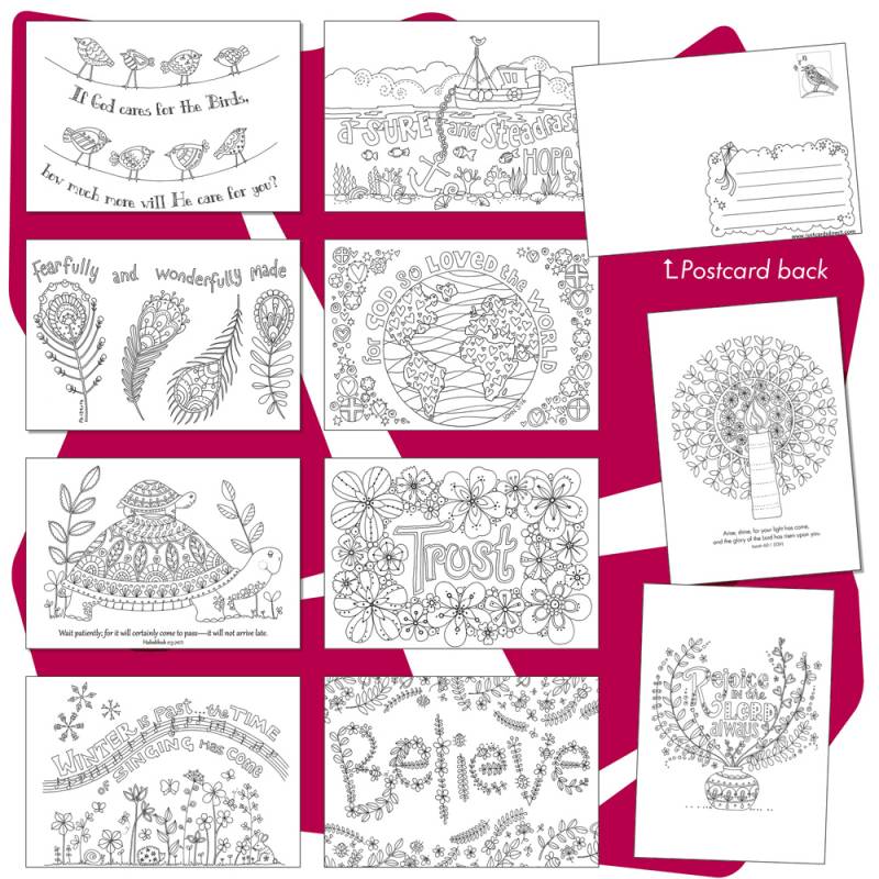 Pack of 10 inspirational Christian colouring postcards, each of a different design. Hand-drawn by artist Jacqui Grace.