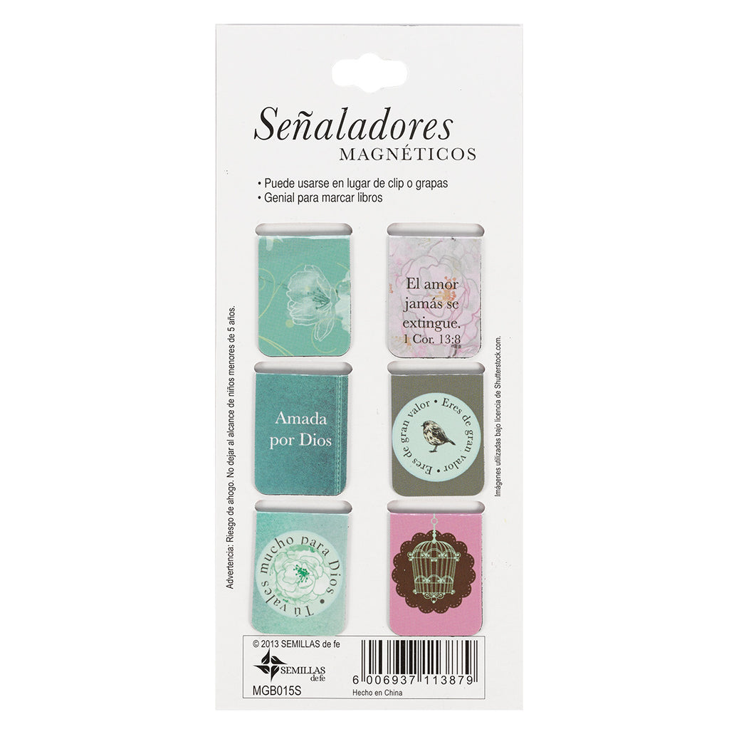 Marque su pagina con estilo con esta colecciOn de seis separadores magnéticos de color pastel. El diseno es una mezcla de arte, hermosos graficos, versiculos de la Biblia y frases inspiradoras. Cada cartOn tiene seis motivos diferentes que hacen juego, y en cada paquete hay tres cartones.