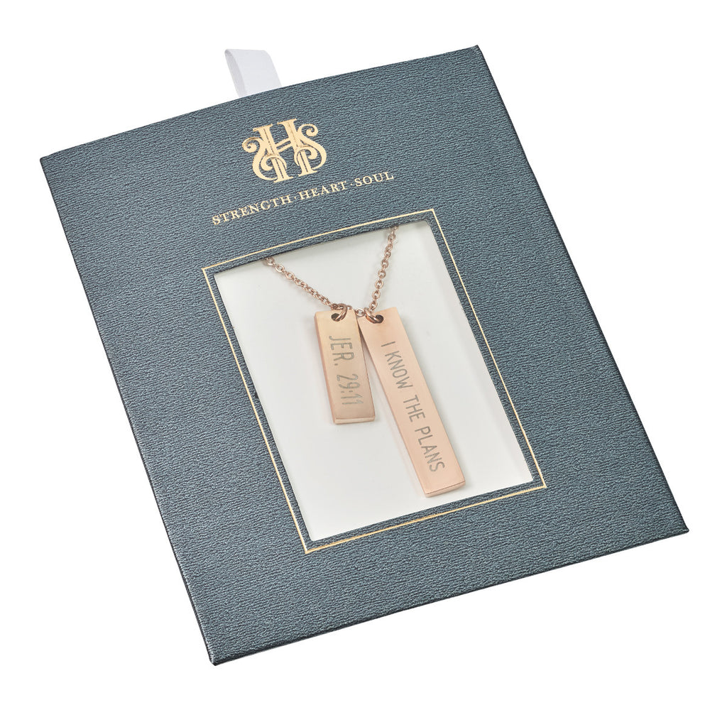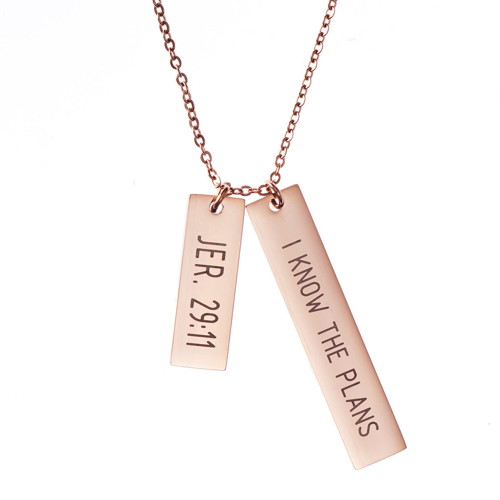 The Jeremiah 29:11 Necklace is made of 316 stainless steel with rose gold plating and displays “Jer. 29:11” on one bar and “I Know the Plan” on another bar, both laser engraved on the Christian necklace. The rose gold necklace has a lobster claw closure and the double bars hang vertically from the rose gold chain.