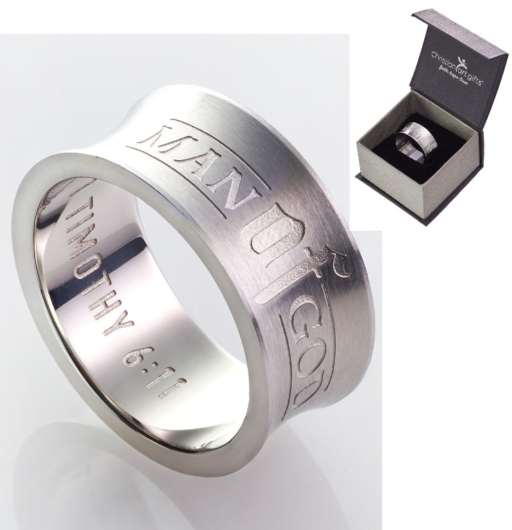 A man of God follows after righteousness, godliness, faith, love, patience, and meekness. This Man of God ring is impressively designed and superbly crafted of stainless steel. This ring has a concave form giving it a trend-setting look. The outside has "Man of God" stamped on a brushed finish and the Scripture reference, 1 Timothy 6:11, on the inside on a smooth polished finish.