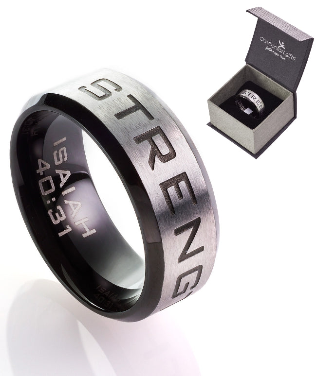 Our strength comes from the Lord and this stunning men's ring will be a daily reminder to look to God on a regular basis for strength and direction. The sophisticated design of the brushed silver top is contrasted by a black beveled edge giving this men's ring a very modern look. The interior of this ring references the Scripture verse, Isaiah 40:31, stamped on a black background.