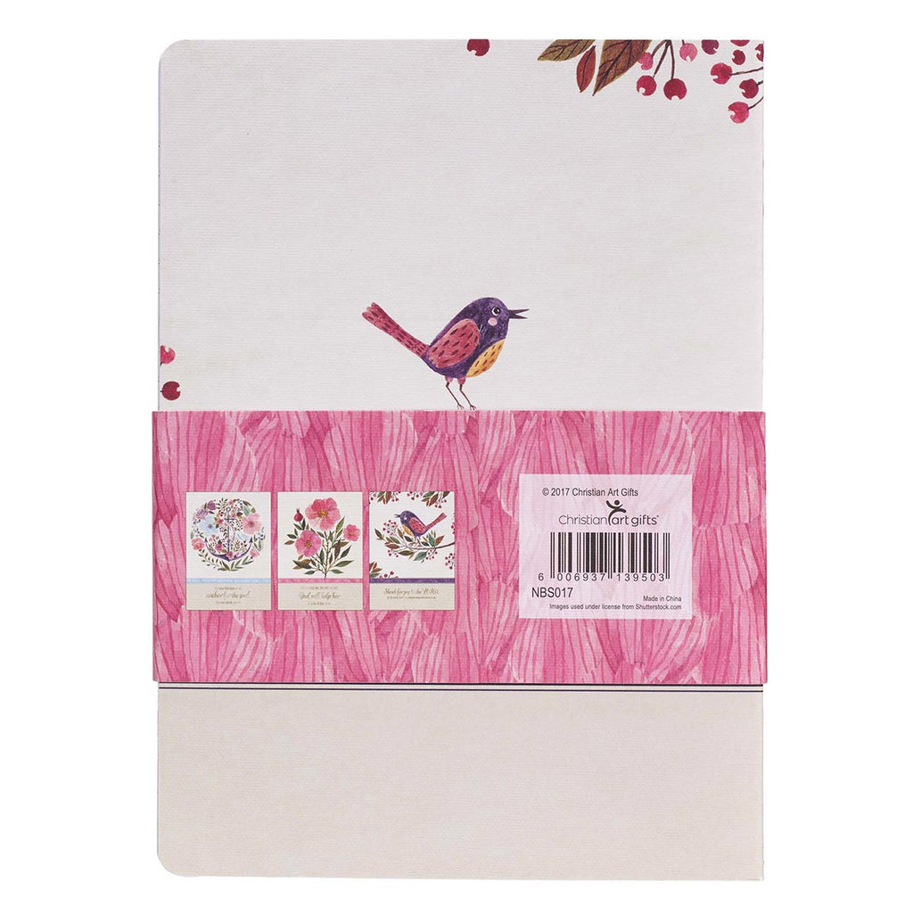 Three delightful designs are included in this set: A floral and anchor design with Scripture from Hebrews 6:19 "We have this hope as an anchor for the soul, firm and secure;" A chirpy bird on a branch with Scripture from Psalm 100:1 "Shout for joy to the Lord, all the earth;" and a thorny rose design with Scripture from Psalm 46:5 "God will help her at break of day." Practical, convenient, take anywhere notebooks with a great inspiring message!