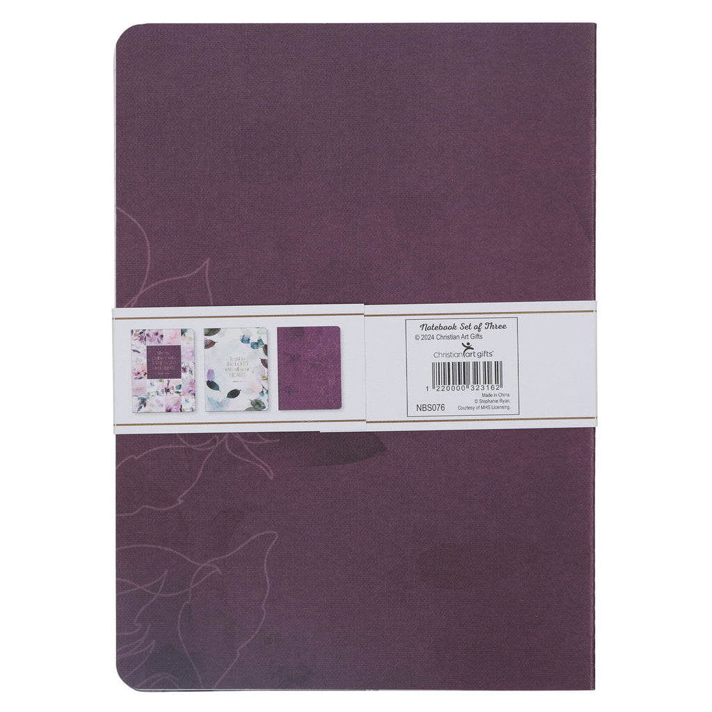 The notebook set has a purple floral theme and uses three Scripture verses as inspiration.