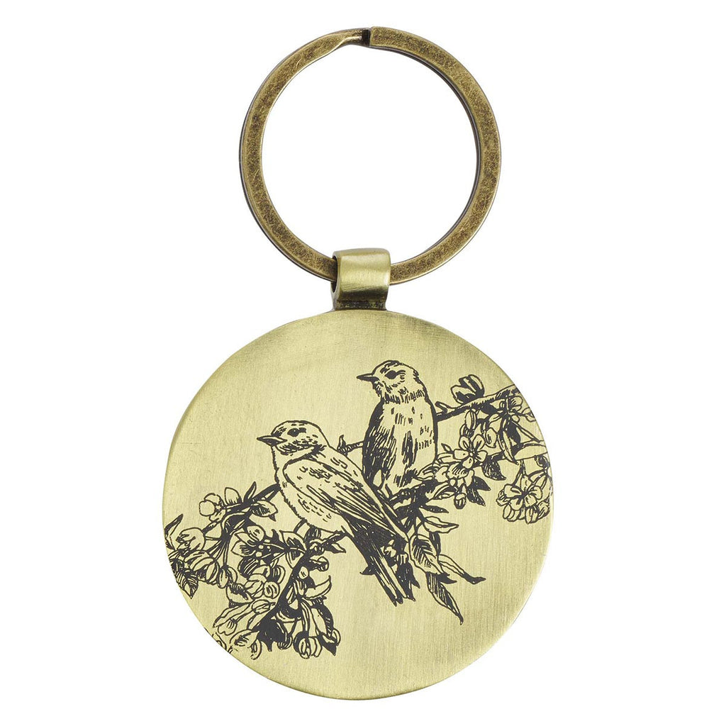 Beautiful light blue flowers and flower buds grow among soft green leaves against a white background. As an added little surprise, an image of birds perched on a blooming branch is engraved into the brass back of the keyring. The scripted dark blue lettering of the title,