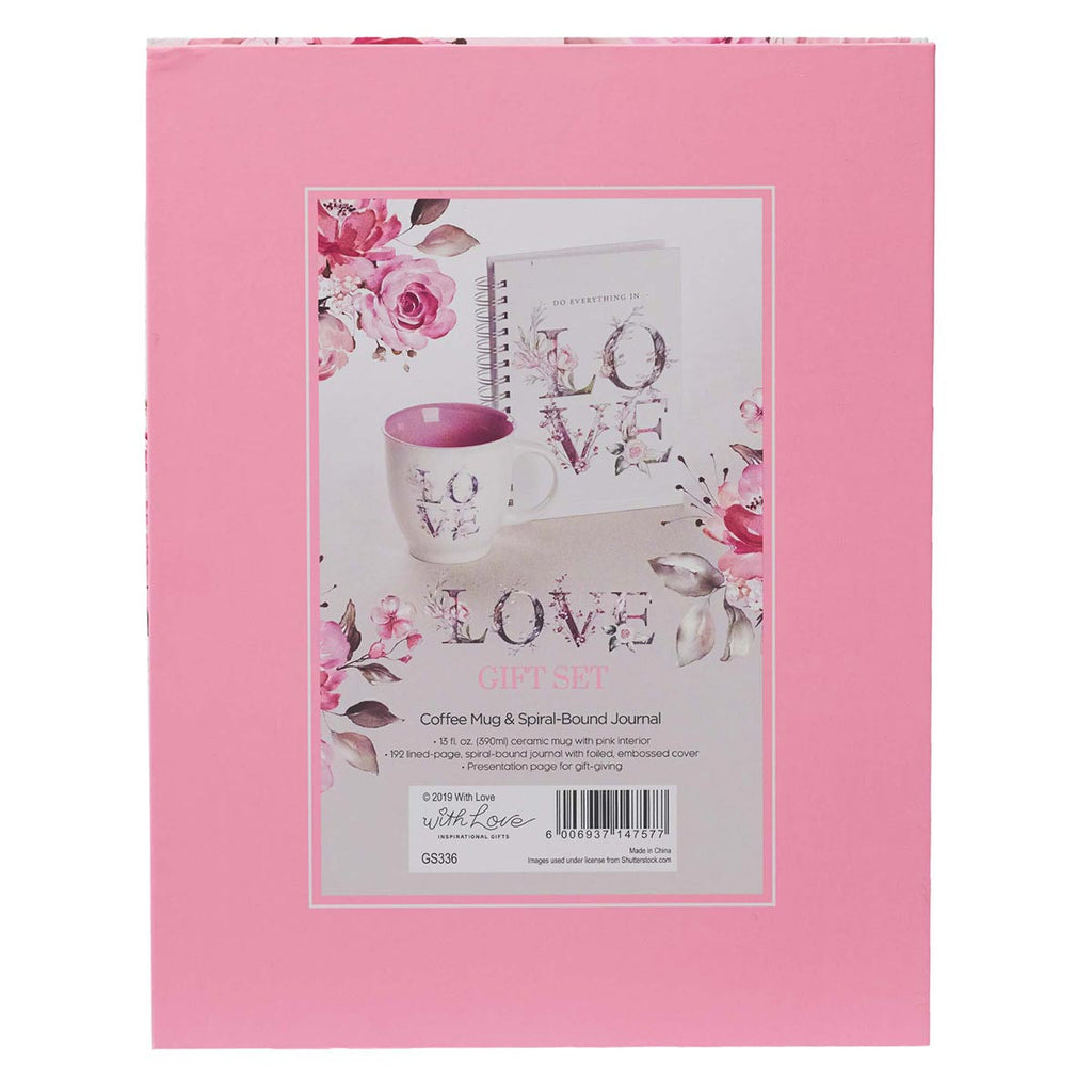 Pink flowers and greenery soften the classic design of the word LOVE on the face of the generously sized ceramic mug, wire-o bound journal, and the beautifully crafted gift box.