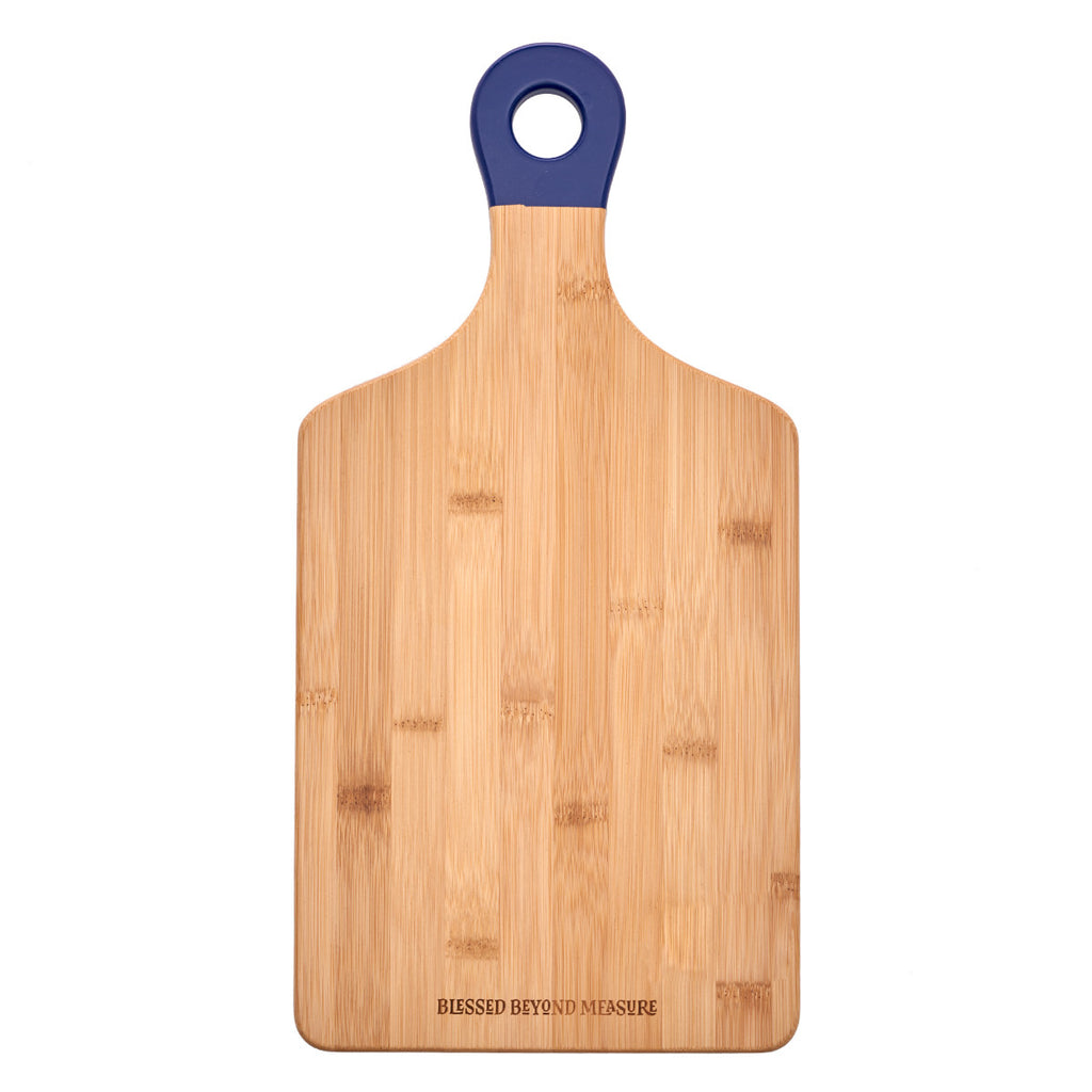 The bambooBlessed Beyond Measure Wood Cutting Board comes with a blue handle to hang. “Blessed Beyond Measure” is etched at the bottom of the cutting board. The wood cutting board is not dishwasher, microwave, or freezer safe and we recommend hand washing all wood items to maintain its beauty.Bamboo Cutting Board