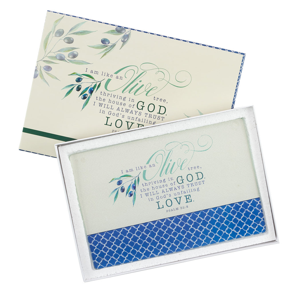The Psalm 52:8 Cutting Board is made of glass and is heat safe up to 392 degrees. Hand washing is recommended for the Olive Branch Cutting Board, which features a navy pattern at the base of the cutting board with the verse from Psalm 52:8 shown in the middle, along with an olive branch drawing.