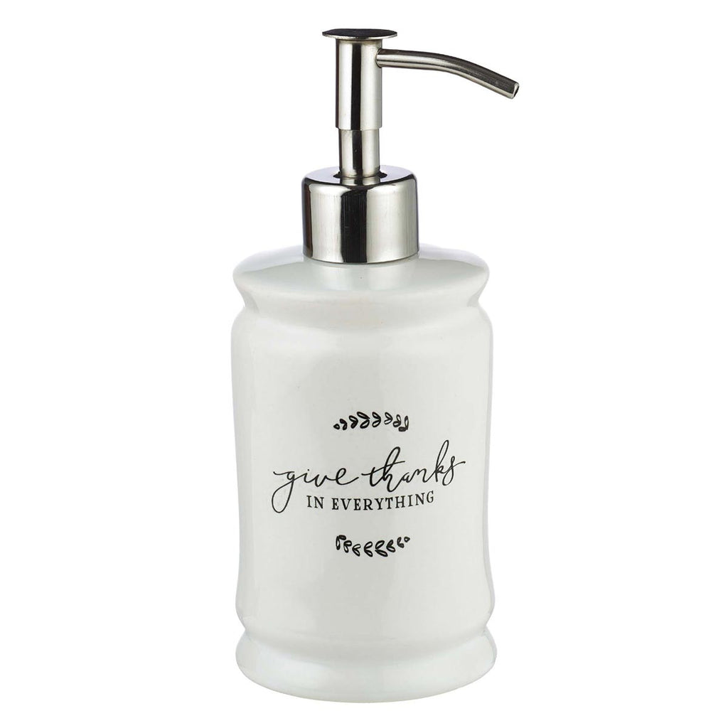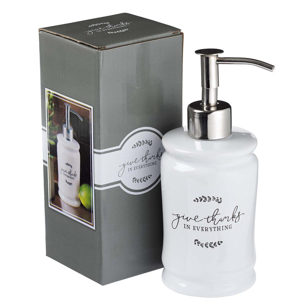 The Ceramic Soap Dispenser is part of the Give Thanks Collection that includes a trinket tray, decorative pillow, pie plate, tea towels, wall art, and wooden spoon set. Each of these items by itself makes a delightful gift but together they create a beautiful set with a meaningful message perfect for Thanksgiving decor. Use it to decorate your own kitchen or gift any combination of these items as a hostess gift.