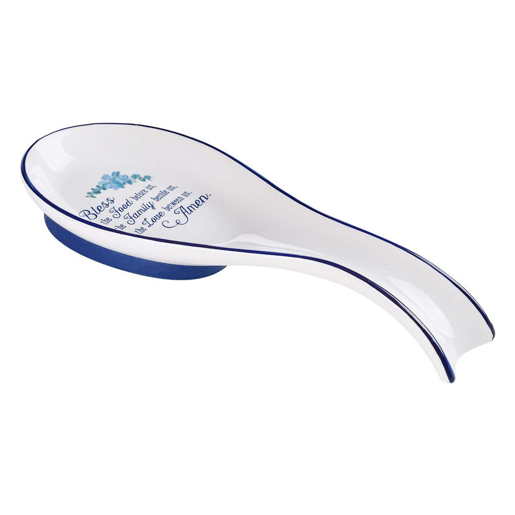 The bright white glazed ceramic Spoon Rest is accented with a royal blue edge. Words from a well-known table prayer are centered on the spoon rest: