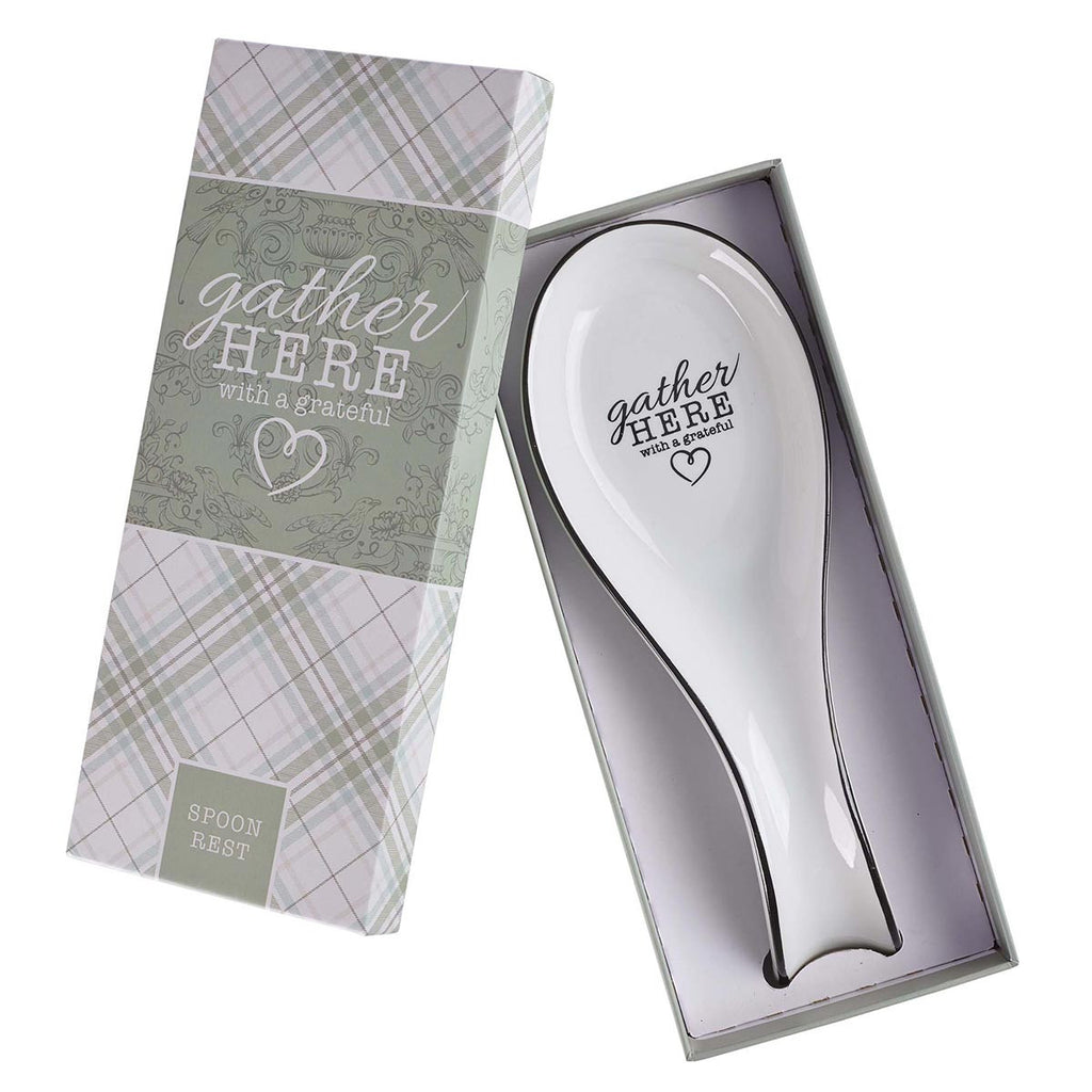 The Gather Here Ceramic Spoon Rest comes packaged in a gift box and is part of the Gather Here Collection. It is dishwasher and microwave safe.
