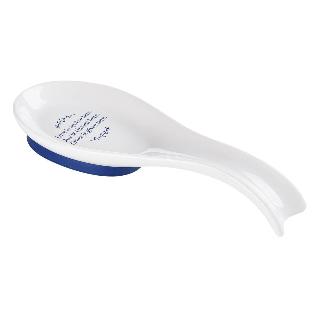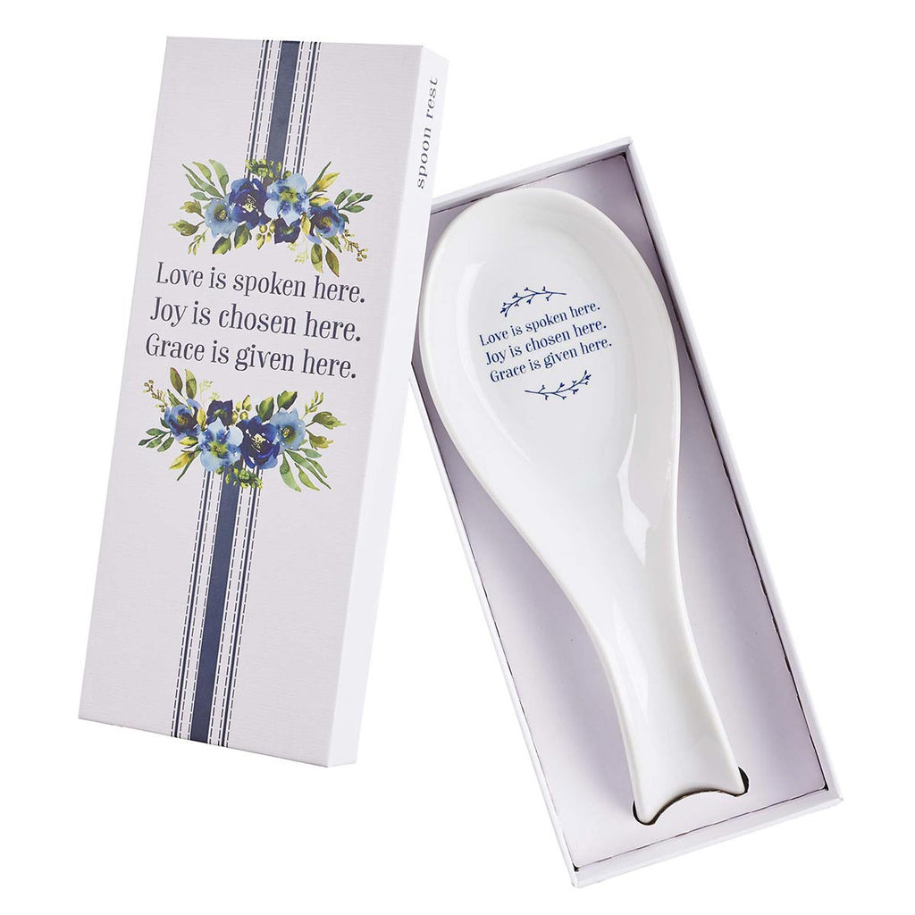 Keep counters and linens clean while cooking or serving with the Love Joy Grace Ceramic Spoon Rest. Whether preparing everyday meals or hosting a special occasion, it is the perfect place to rest a spoon. Its virtuous message reminds us to make a conscious effort each day to speak lovingly, choose joy over happiness, and show grace and kindness to others.