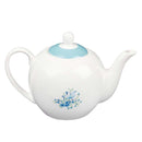 The inscription is written in blue in a casual handwritten style. The opposite side of the ceramic teapot depicts a bluebird perched on a spray of blue flowers. The light blue lid has a stopper to keep the lid secure while pouring.