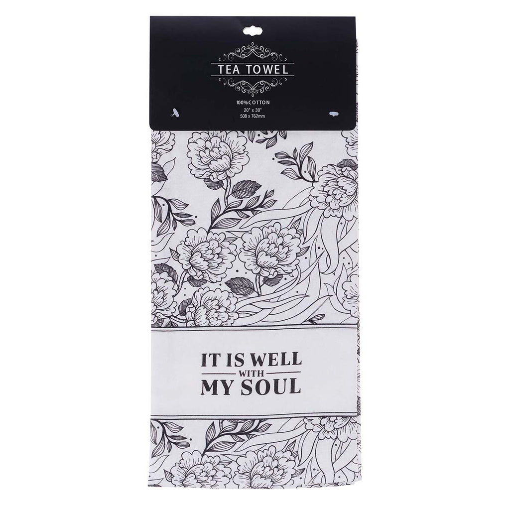 The It Is Well With My Soul Cotton Tea Towel is ornately designed with a black and white sketched antique floral pattern that will match any kitchen decor. The sentiment is printed in the center of a white band that runs along the bottom of the towel to stand out when the tea towel is folded or hung.