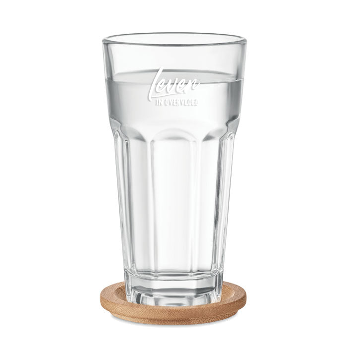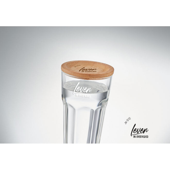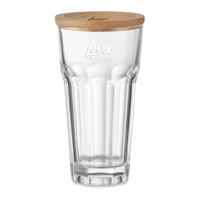 Herbruikbare glazen beker met een bamboe deksel dat ook als onderzetter kan worden gebruikt. Een mooi ontworpen glas voor dagelijks gebruik met een multifunctioneel deksel. Door het bamboe deksel onderscheidt het glas zich van alle andere.