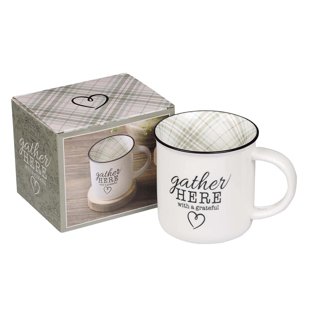 The white ceramic coffee mug comes with a gray and green plaid design on the interior. A black rim against the white exterior accentuates the message "Gather Here with a Grateful heart," printed in black.