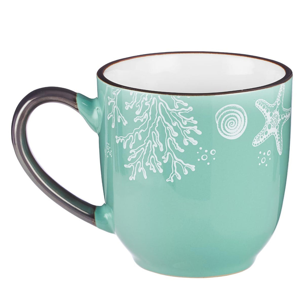 Graphics of starfish and coral reefs dance across the seafoam green cup along with the golden words from Matthew 11:28, “I will give you rest.” The blue morphs into a brown handle and rim with a white interior. Truly a treasure!